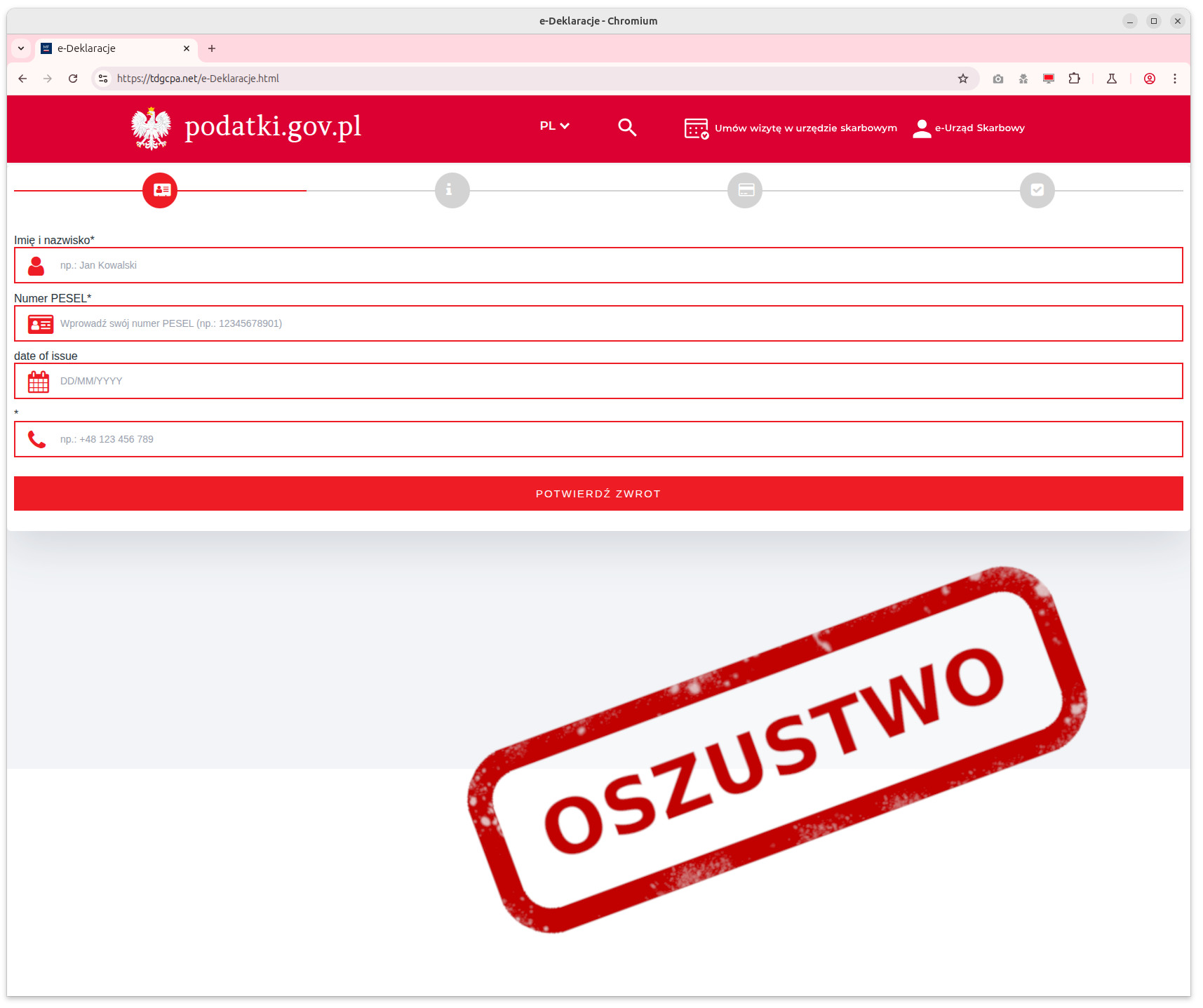 - Podejrzane linki i załączniki. Maile od przestępców zawierają linki podszywające się pod strony internetowe KAS, serwisu Profil Zaufany czy podatki.gov.pl. Po kliknięciu jesteśmy przenoszeni do fałszywej witryny, która wizualnie łudząco przypomina oficjalny serwis, ale ma inny adres domeny np. “e-urzadskarbowy5.servicedetails.com.es/pl/” zamiast “podatki.gov.pl”. Strona prosi o podanie danych logowania do Profilu Zaufanego pod pretekstem “dokończenia procedury”.
