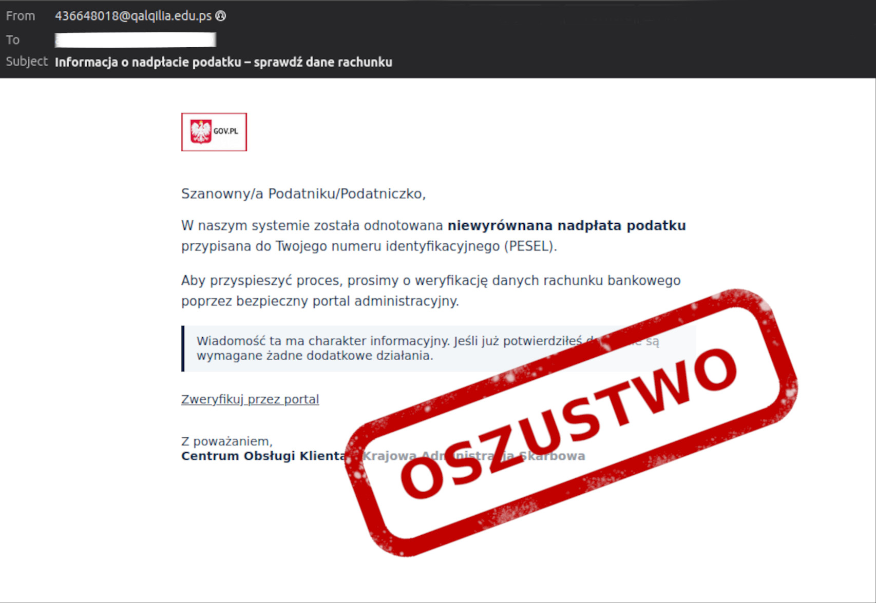 Przykładowo, jeśli wiadomość pochodzi od kontakt@podatki-gov.com, to nie jest to wiadomość z państwowego urzędu. Instytucje rządowe korzystają z adresów e-mail w domenie @gov.pl.