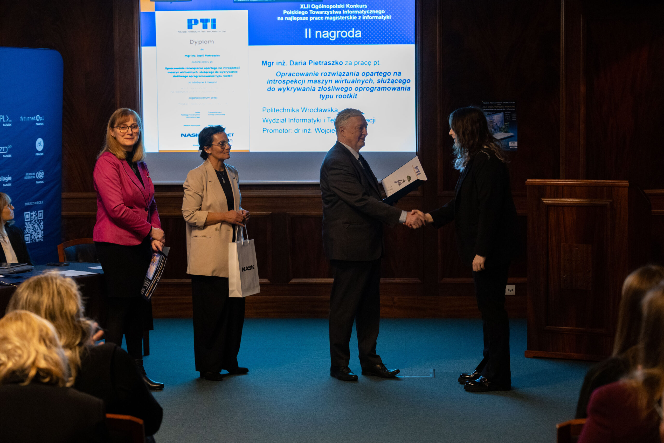 - II nagroda w wysokości 10 500 zł trafiła do mgr inż. Darii Pietraszko za pracę „Opracowanie rozwiązania opartego na introspekcji maszyn wirtualnych, służącego do wykrywania złośliwego oprogramowania typu rootkit” przygotowaną na Politechnice Wrocławskiej pod kierunkiem dr. inż. Wojciecha Wodo,